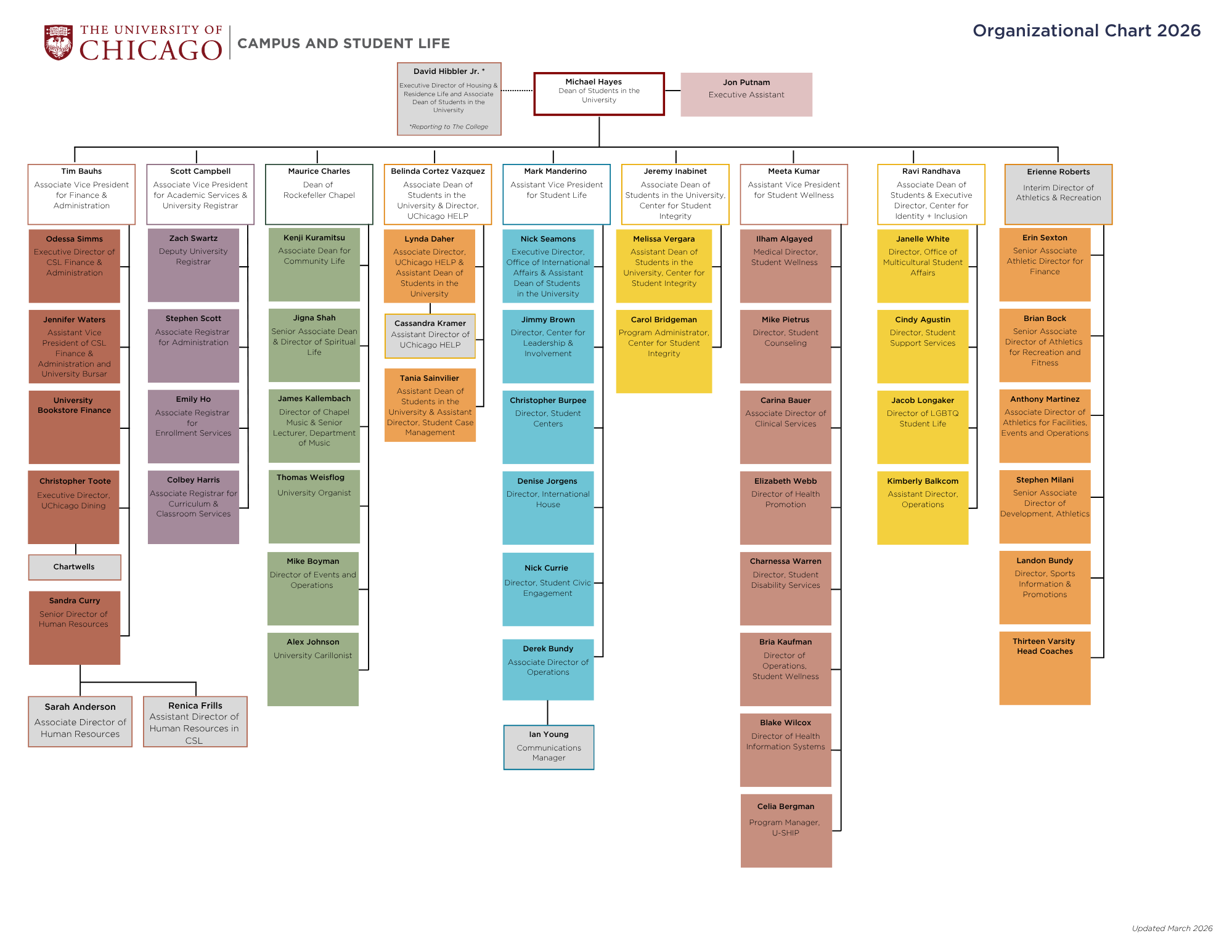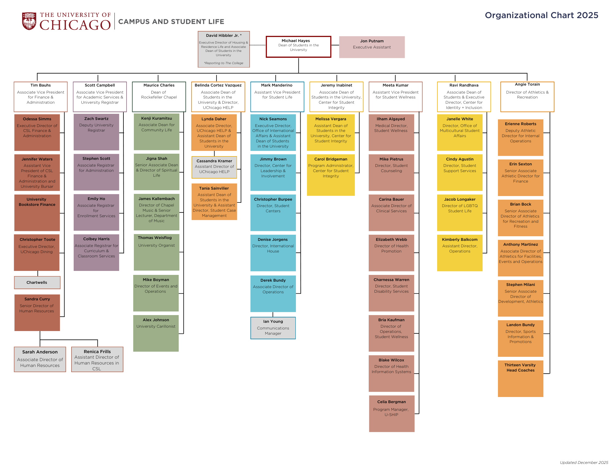 Leads, manages, and provides strategic direction for key areas within Campus and Student Life, including the Center for Leadership and Involvement, International House, the Office of International Affairs, the Student Centers, and operations within CSL’s central offices. The Assistant Vice President for Student Life works to enhance the quality and distinctiveness of the student experience at UChicago by fostering communities that encourage intellectual curiosity and debate; supporting opportunities for leadership development and personal growth; and enhancing daily student life and campus culture.